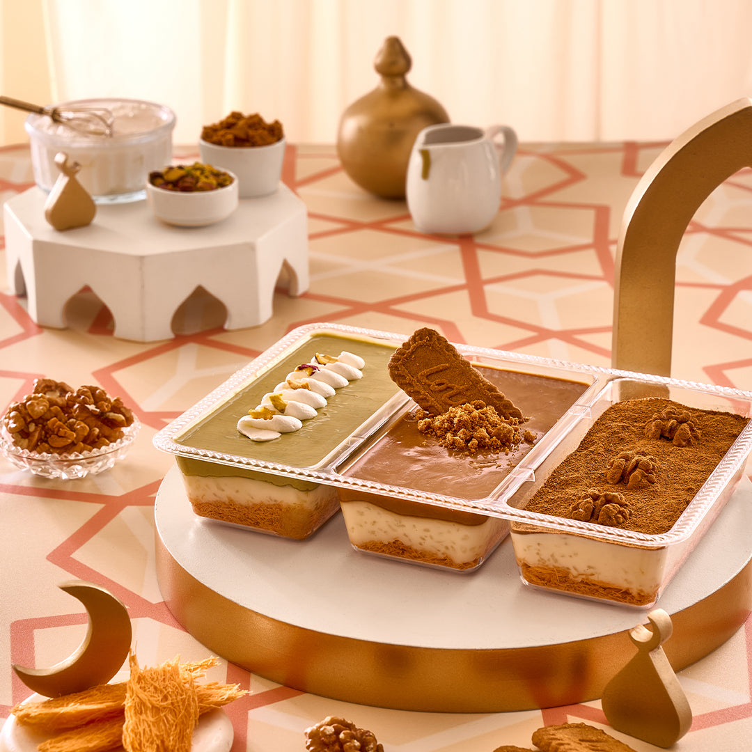 Layers of crispy kunafa and Turkish-style rice pudding, topped with cinnamon, Lotus, and luscious pistachio cream. A perfect mix of crunch, creaminess, and aromatic sweetness.